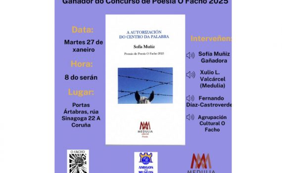 Desde a Agrupación Cultural O Facho comunicámosvos a celebración do seguinte acto, dentro das Palestras públicas do primeiro trimestre de 2026. O vindeiro día 27 de xaneiro, intervirán na presentación do libro Autorización do centro da Palbra: Sofía Muñiz, gañadora do premio, Xulio L. Valcarcel ( Medulia), Fernado Díaz- Castroverde e un representante […]